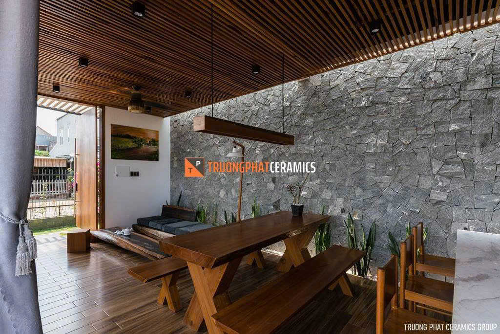 Mang tông màu vàng ấm áp, xen lẫn vân gỗ tự nhiên. Đây là lựa chọn số 1 cho các resort, biệt thự phong cách Châu Âu hoặc nhà vườn, tạo cảm giác gần gũi và sang trọng.