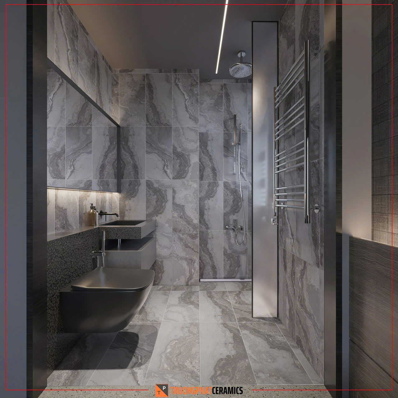 Thẩm mỹ cao: Sự kết hợp giữa sắc đen và họa tiết vân đá/sóng tạo nên vẻ đẹp đẳng cấp, sang trọng, tinh tế. Gạch đen có khả năng che đi các vết bẩn tốt.
